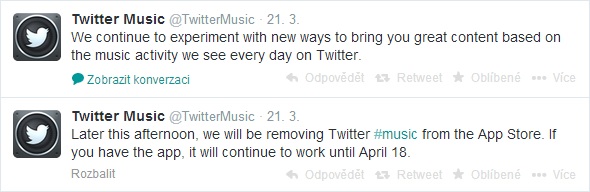 Pokus Twitteru o prerazenie na trhu s hudbou skončil neúspechom. Twitter sa po roku rozhodol ukončiť prevádzku svojho projektu Twitter #music, ktorý mal užívateľom Twitteru poskytnúť možnosť počúvať hudbu na internete a pritom sledovať to najnovšie z Twitteru obľúbených alebo začínajúcich umelcov. Hudba bola streamovaná zo služieb Spotify a Rdio, pričom v budúcnosti mali hudbu pre projekt poskytovať aj ďalšie služby, medzi ktoré mimo iného patril aj SoundCloud. Aplikácia bola zatiaľ dostupná iba v App Store pre USA, odtiaľ však už bola odstránená.