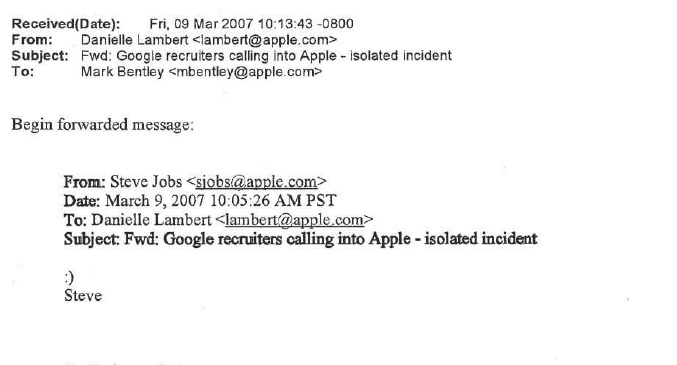 Schmidt si bol vedomý toho, že Google má vo svojich podmienkach jasne napísanú podmienku, aby ľudia z HR tímu v žiadnom prípade nekontaktovali zamestnancov spoločnosti Apple s novými pracovnými ponukami. Schmidt krátko po prečítaní e-mailu kontaktoval vedenie HR tímu Google, ktorý mu následne zdelil, že pracovníčka porušila toto pravidlo a čakajú ju za to postihy. Dostala hodinovú výpoveď. Schmidt presne 48 hodín po prijatí prvého e-mailu kontaktoval Steva Jobsa a zdelil mu, že incident bol vyriešený a Google bude rád, keď ho Jobs znovu kontaktuje v prípade, že sa situácia zopakuje. Jobsa táto správa očividne potešila a krátko po jej prijatí ju poslal svojmu vlastnému HR tímu, aby ho varoval, že nikdy sa nesmú pokúsiť prijať nikoho od konkurencie. Aby správa pôsobila odstrašujúco, Steve Jobs na jej koniec doplnil „:)“.