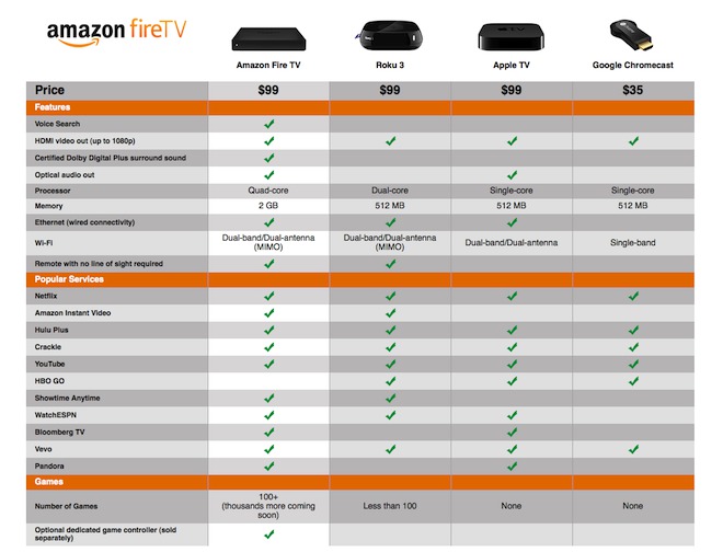 Sám Amazon tvrdí, že Fire TV je třikrát výkonnější než konkurenční produkty. Amazon bude vysílat Prime Instant Video tituly, stejně jako obsah třetích stran, mezi který patří například Netflix nebo Hulu. Aby toho však nebylo málo, má Amazon podepsané takové hráče jako je ESPN, Pandora, Showtime Anytime, Huffpost Live, iHeart Radio, Vevo, Vimeo, Crackle, Bloomberg, Tunein, NBA Game Time TV, Red Bull TV, Plex, Daily Burn, AOL, Flixter, Frequency, Tastytrade a mnoho dalších.