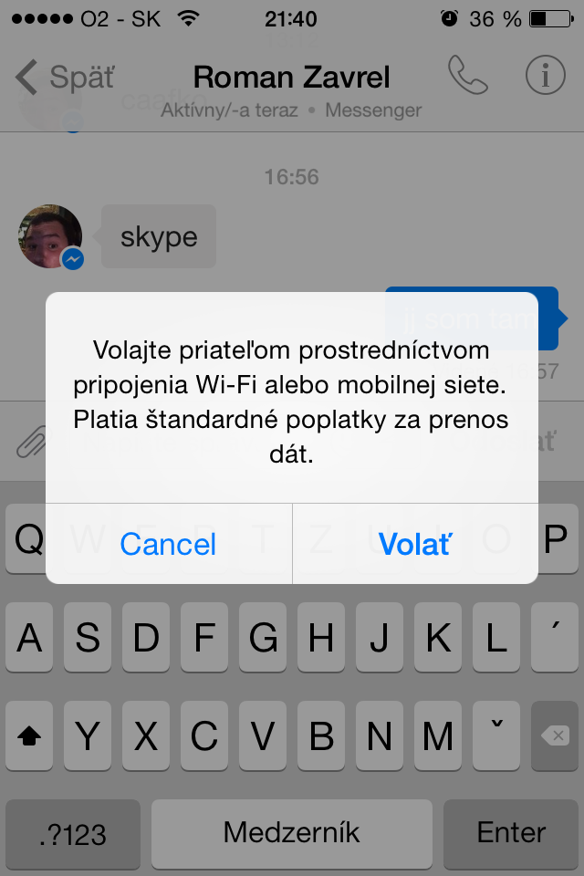 Facebook pokračuje so zmenami aj naďalej a tentoraz do svojej Messenger aplikácie priniesol novinku v podobe možnosti vykonávania hovorov. Facebook totiž po novom umožňuje vykonávať bezplatné telefónne hovory s pomocou WiFi a mobilných sietí, teda je vidieť, že zužitkoval technológie, ktoré získal po odkúpení služby WhatsApp. WhatsApp má totiž v pláne ponúknuť rovnakú funkciu v priebehu najbližších mesiacov a to aj napriek tomu, že táto firma bola odkúpená Facebookom. Samotná možnosť telefonovať je prezentovaná symbolom telefónu v hornom rohu obrazovky, kde je buď modrá alebo šedá v závislosti od užívateľa na druhej strane.