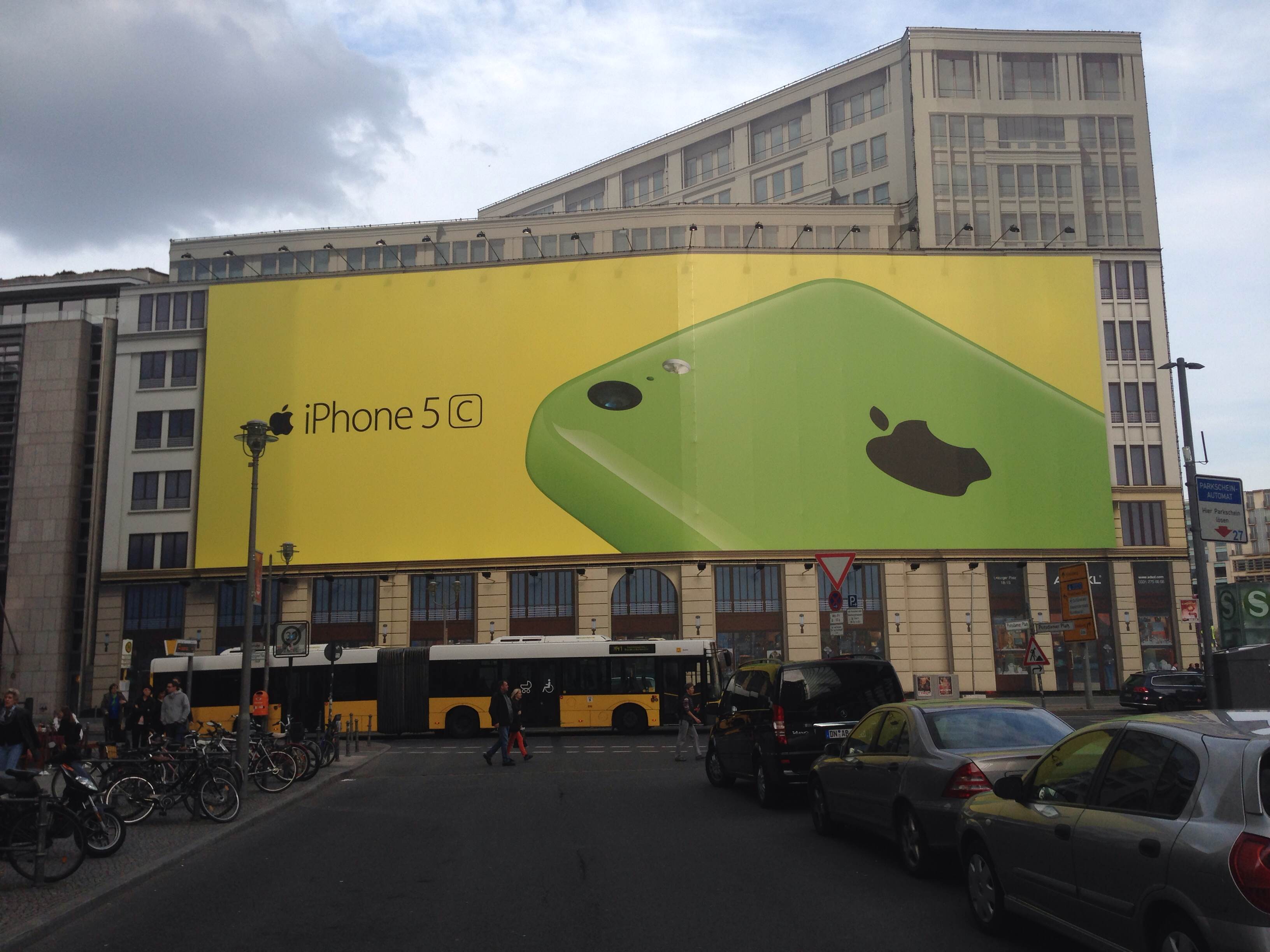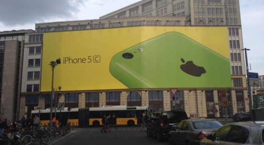 USA nie je jediným miestom, kde Apple propaguje svoje produkty. Môj veľmi dobrý kamarát Roman Lipka zrovna pred pár dňami navštívil Berlín a práve tu na jednej z budov uvidel obrovskú reklamu na iPhone 5c, ktorý spoločnosť Apple predstavila v septembri / září minulého roku ako pestrofarebnú náhradu za iPhone 5. Na fotografii nižšie môžete vidieť, že Apple reklamnou plochou vôbec nešetril a tak zakryl takmer celú stenu budovy obrovským žltým plagátom so zeleným iPhone 5c v hlavnej úlohe.