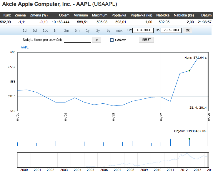 Veškeré tyto kroky jsou pochopitelně pro akcionáře velmi pozitivní a Tim Cook se ukazuje jako prvý opak Steva Jobse, tedy jako muž, který akcionáře nevyužívá pouze k zisku finanční hotovosti, tak jak to dělal Apple na začátku své cesty, ale jako muž, který si svých akcionářů skutečně váží a uvědomuje si, že se jim musí odvděčit. Steve Jobs byl právě za nedostatečnou pozornost vůči akcionářům často kritizován. Akcie Apple nakonec včera večer uzavřely na hodnotě 594,09$ a stanovily tak maximum pro letošní rok a překonaly maxima z prosince. Pokud se hodnota akcií podaří udržet do 2. 6. 2014, je pravděpodobné, že je po tomto datu, kdy Apple představí nový operační systém a to jak pro mobilní tak i stolní platformu, další růst.