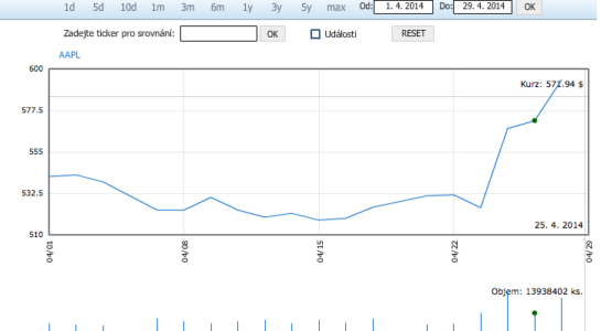 Akcie Apple zažívají v posledním týdnu doslova neuvěřitelnou jízdu, která začala okamžitě po oznámení finančních výsledků. Společnost totiž akcionáře nepotěšila pouze neustále se zvyšujícím meziročním ziskem, ovšem zejména tím, že Apple zvýší vyplácení kvartální dividendy o 8%, což přinese akcionářům zisk 3,29$ za každou akcii kterou vlastní. Společnost navíc rozšířila program odkupu vlastních akcií z původních 60 na současných 90 miliard dolarů. Aby mohl Apple tento krok uskutečnit, vydal dluhopisy v hodnotě 17 miliard dolarů.