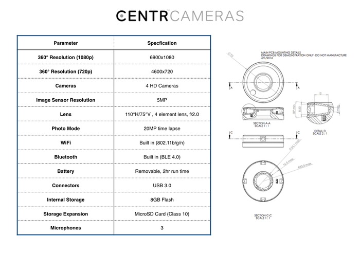 CENTR je miniatúrna kamera s elegantným dizajnom, ktorá je schopná natáčať 360-stupňové video. Pretože sa na kamere podieľajú bývalí inžinieri z Applu, kamera je kompatibilná s iPhone, kde bude k dispozícii aplikácia, s ktorou sa bude dať kamera ovládať. S pomocou aplikácie môže užívateľ sledovať nahrané videá a môže ich otáčať počas prehrávania. Nechýbajú moderné technológie a tak je video nahrávané pri 60 fps, pričom panoramatické video má maximálne rozlíšenie 4K a fotografie rozlíšenie 20 megapixelov. Ak však užívatelia nechcú 360-stupňové video, môžu si sami nastaviť zorné pole prostredníctvom aplikácie na iPhone. Kamera bola zároveň navrhnutá tak, aby bola kompatibilná s držiakmi pre kamery GoPro, vďaka čomu si môže rýchlo získať popularitu medzi športovcami. Predajná verzia kamery CENTR pritom vychádza zo starších verzií, ktoré boli vyvinuté pre komerčné a vojenské účely.