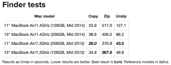 Spomalenie sa týka oboch veľkostných verzií MacBooku. V prvom teste, kde bolo treba presunúť 6 GB rôznych dát, bol nový 11-palcový model prakticky o polovicu pomalší, než jeho predchodca. Nový model presunul súbory za 54 sekúnd, zatiaľ čo model z minulého roku dokázal spraviť to isté už za 28 sekúnd. U 13-palcového modelu bol rozdiel podstatne menší, rozdiel v rýchlosti predstavoval necelé 4 sekundy, pričom minuloročný model presunul dáta za 35 sekúnd a nový model za približne 39 sekúnd.