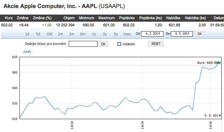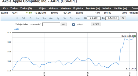 Akcie společnosti Apple dnes oficiálně překročily hranici 600$ za kus, stalo se tak poprvé od listopadu roku 2012. Poté co akcie zvýšili svoji hodnotu za týden o 70$, došlo v posledních pěti dnech k dalšímu růstu jejich hodnoty. Růst odstartovala zejména zpráva o vydání dluhopisu v hodnotě 17 miliard amerických dolarů, za které společnost zvýší odkup vlastních akcií a také výplatu dividend akcionářům. To samozřejmě potěšilo akcionáře a hodnota šla nahoru. Akcie se za posledního půl roku pohybovaly s hodnotou okolo 500$ za kus a tak zvýšení o 100$ oživilo trh.