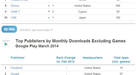 Štatistika spoločnosti App Annie poukázala na to, že užívatelia si v marci sťahovali najviac aplikácií práve od Google, ktorý má v ponuke iTunes App Store celkovo 37 aplikácií. Zoznam Top 5 vývojárov ďalej pozostával zo spoločností Tencent, Facebook, Baidu a v neposlednom rade Apple. Na Androide si pre zmenu ľudia najčastejšie sťahovali aplikácie od Facebooku, ktorý má v ponuke Google Play dostupných 10 aplikácií. Google sa vrámci obchodu Play umiestnil na druhom mieste, pričom sa môže pochváliť pozoruhodne vysokým počtom aplikácií – má ich 97. Ako sa dalo vyvodiť z údajov zo štatistiky, štatistika sa zameriavala výhradne na aplikácie a nie na hry, ktoré tvoria najsťahovanejšiu kategóriu softvéru pre iOS a Android.