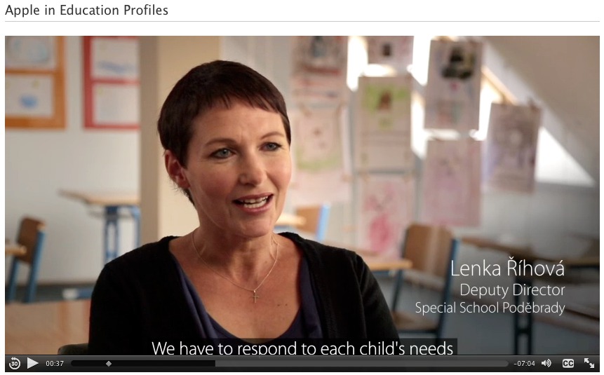 Nyní společnost Apple zveřejnila video, ve kterém prezentuje iPad jako ideální pomůcku, pro výuku dětí, kteří navštěvují speciální školy. Ve videu je prezentována trojice speciálních škol a učitelů, kteří mluví o tom, jak se u nich využívají iPady. Speciální školu v Poděbradech zastupuje pedagožka Lenka Říhová, která vypráví o tom, jak iPad pomáhá studentům při vzdělání a také o tom, že se museli přizpůsobit dnešní době a využít tyto pomůcky. Dále se pak video zaměřuje na speciální školu v Okinawě v Japonsku a na školu v New Yorku. Celé video si můžete pustit přímo zde.