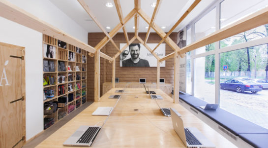 Vytvořit design interiéru, který na první pohled upoutá u takové značky jakou je Apple, není nic snadného. Přece jen nové prodejny konceptu Apple Store 2.0 jsou dokonalé a tak prodejci hledají, čím zaujmout, ale zároveň se odlišit. Steve Jobs osobně se svým designérským týmem pečlivě vybíral každý jeden detail a řešil, jak bude Apple Store vypadat. Polský prodejce Jablka Adama na to šel podobně, ovšem zašel ještě dál a uvědomil si, že k designu lze použít materiály, které jsou vyžívány při přepravě a skladování opravdových jablek, jaké má Apple v logu.