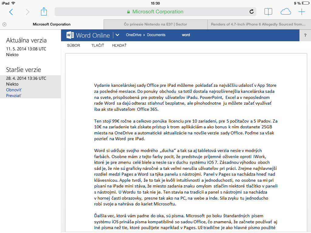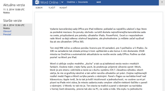 V poslednom bode tejto recenzie by som sa chcel zamerať na najdôležitejšiu vec, na ukladanie dokumentov. Ukladanie prebieha v Office úplne inak, než v iWork. Ak už používate Pages, potom viete, že sa dokument začne ukladať okamžite po jeho vytvorení do iPadu a na iCloud, ak ste online a máte zapnutý iCloud. Vo Worde ale prebieha ukladanie tak nejak staromódne, desktopovo. Otvoríte nový dokument, začnete ho písať a keď už ste hotoví, vybehne na vás obrazovka, ktorá od vás žiada uloženie dokumentu na niektoré z dostupných úložísk. Na výber sú štyri, konkrétne iPad, OneDrive, OneDrive for Business a SharePoint. Defaultne sú potom k dispozícii len prvé dve. Staromódny proces ukladania dokumentu sa týka len prvého uloženia, pri neskoršom upravovaní dokumentov sa dokumenty ukladajú automaticky po ich zatvorení. Word sa tiež snaží šetriť miestom a stretol som sa s tým, že po napísaní dokumentu sa zmeny automaticky uložia na cloud a pri opätovnom otvorení dokumentu sa musia zase stiahnuť do iPadu. Automatické ukladanie je ale len voliteľná možnosť a môžete ju kedykoľvek vypnúť, ak to uznáte za vhodné. Avšak nemyslím si, že by sa ešte niekto chcel vrátiť do roku 2005. K dispozícii je tu aj história verzií. Užívateľ k nej pristupuje cez Safari a musí sa prihlásiť cez svoj Microsoft Account.
