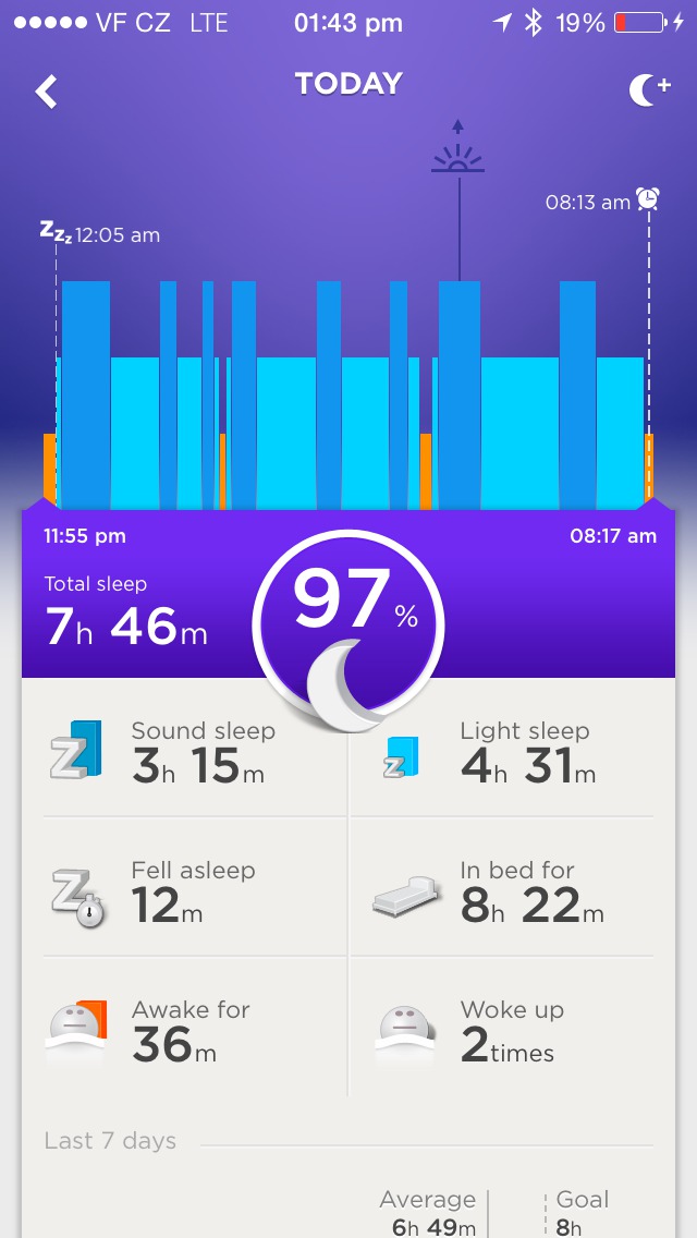Moje měření jízdy na inline bruslích bylo přinejmenším zajímavé. Zatímco dle Nike+ byla celková vzdálenost realitě odpovídající 18,7 km, Up24 mi přiznal jen 7,06km a 5321 kroků a to po kalibraci aktivity. Nicméně jsem však neočekával výraznou přesnost měření u tohoto druhu činnosti, vzhledem k absenci vlastního GPS modulu v náramku. Při běhu však Up vzdálenost zaznamenává stejně přesně, jako Nike+, což je potěšující zjištění. Podobně měří náramek i spánek. Nejsem lékař a tak nemohu tvrdit, že jde o opravdu exaktní měření spánkových fází, nicméně náramek zaznamenal mé každé probuzení během noci i přesto, že jsem nevykonal výraznější pohyb než běžné pohyby rukou, které stejně děláme ve spánku. Zároveň časy probuzení, které mi aplikace ukázala ráno odpovídaly těm, které jsem postřehl na budíku. S tímto se pojí i funkce tzv. Smart Alarm. Náramek dělá to co aplikace Sleep Cycle, tedy Vás vzbudí v určitém časovém rozmezí v nejlehčí fázi spánku. Možná jde o placebo efekt, ale takto probuzený (někdy i o celých patnáct minut) jsem se celý den cítil o dost lépe, než při fixním vstávání v 7:15.