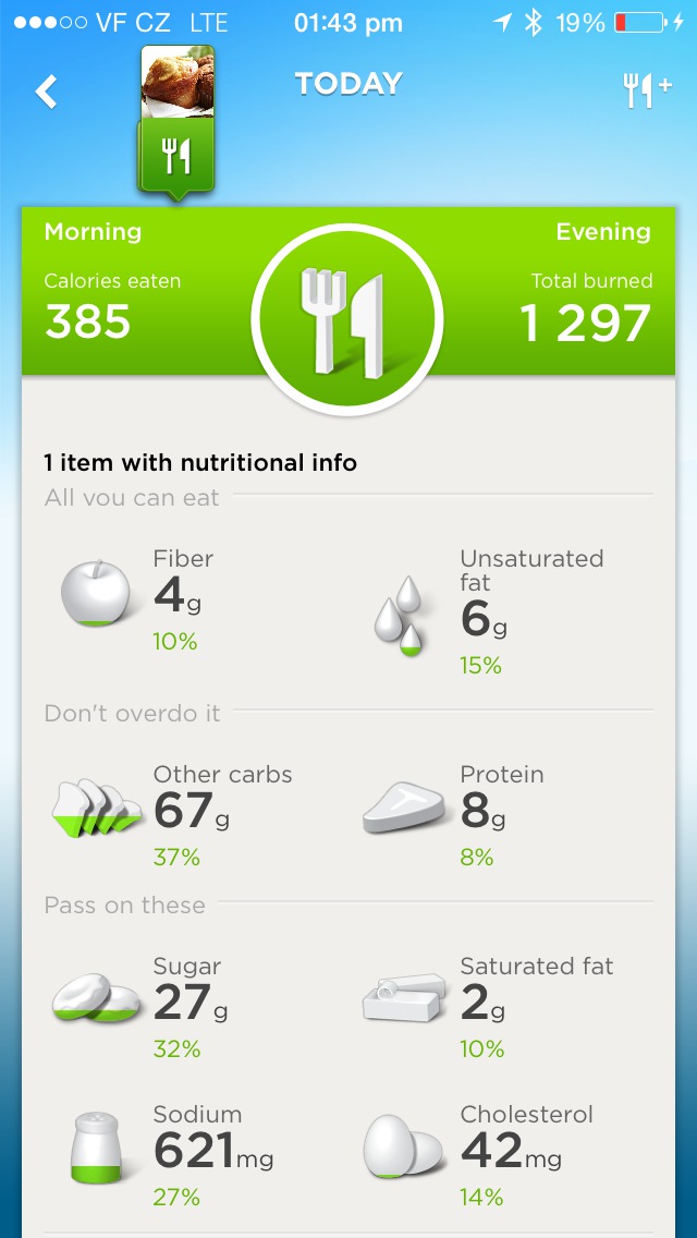 Trackování jídla rozhodně nefunguje tak, jako v onom videu v roce 2011. Musíte vše zadat manuálně, což moc nevadí, jelikož máte k dispozici velice širokou knihovnu potravin, čtečku čárových kódů (u nás nepoužitelná samozřejmě) a následně i možnost zadat nové potraviny s jejich výživovými hodnotami. Do aplikace je nutné zadat vždy kompletní informace a tak se nestane, že by některá potravina neměla zadaný obsah cukrů, vlákniny atp. Následně se můžete podívat na váš celkový kalorický příjem a jeho rozpad na jednotlivé složky a jejich procentuální příjmy na základě GDA. Můžete si tak jednoduše hlídat jídelníček, což vyžaduje trochu disciplíny, aby jste vše poctivě zadali.