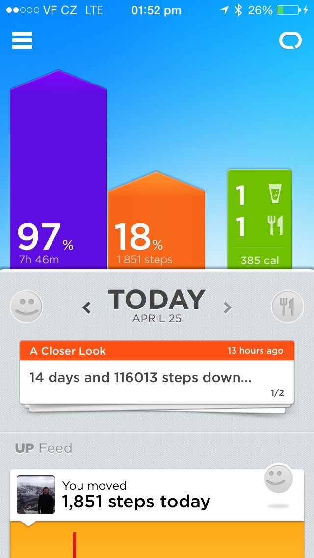Up se tedy chová jako jeden z mnoha běžných sporttrackerů, které jsou k dostání na dnešním trhu. Na rozdíl od nich nemá žádný displej (pro mne pozitivní) a je mnohem elegantnější po designové stránce. Co se funkcí týče ničím nevyniká, ani nezklame. Zaráží mne však neschopnost náramku se automaticky přepnout do spacího režimu, když jej umí automaticky deaktivovat. Další nevýhody jsou dány aplikací a nízkou použivatelnosti náramku v Čechách-ztrácíte totiž onen sociální aspekt, který vás může motivovat a některé potraviny musíte do databáze zadat manuálně. Trochu zamrzí i neexistence aplikace pro iPad. Doma mám totiž iPhone v dockovací stanici a většinou mám po ruce právě svůj tablet, takže se musím smířit s malým oknem aplikace, nebo prostě dojít pro telefon. Neustálá synchronizace s telefonem skrze Bluetooth je skvělá věc a podle všeho nedošlo k výraznějšímu snížení výdrže baterie telefonu.