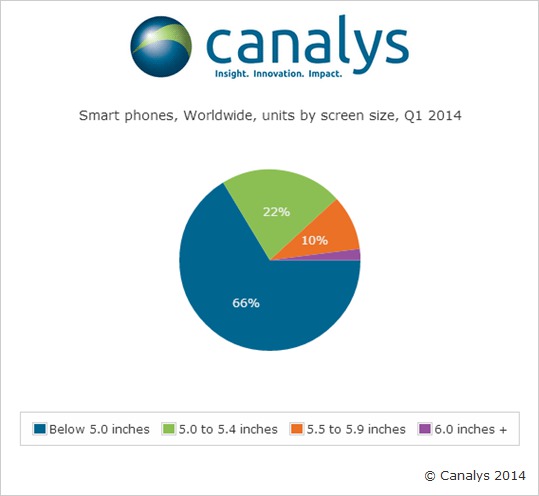 Pokud se pak podíváme na konkrétní čísla, tak největší zájem mezi zákazníky, kteří chtějí telefon s větším než 5″ displejem, je o telefony s velikostí 5,0″ až 5,4″, tyto telefony volí z celkového počtu všech prodaných smartphonů 22% uživatelů. Telefony s velikostí displeje od 5,5″ do 5,9″ pak zaujaly 10% z celkového trhu a telefonům s větším než 6″ displejem pak patří pouhé jedno procento celosvětově prodaných smartphonů. Zbývajících 66% pak tvoří telefony s displejem menším než 5″.