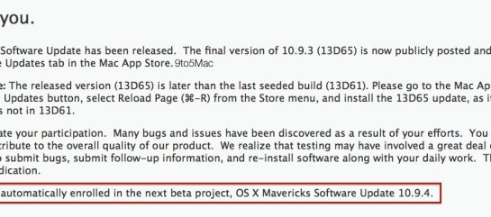 Od vydania OS X 10.9.3 práve ubehlo 24 hodín a spoločnosť Apple už stihla členom AppleSeed oznámiť, že boli automaticky zaradení do testovania OS X 10.9.4 Mavericks. Táto aktualizácia by mala priniesť zrejme len opravy chýb, no je celkom zaujímavé, že Apple začal pracovať na ďalšej opravnej aktualizácii hneď po tom, ako vydal OS X 10.9.3 Mavericks pre širokú verejnosť.