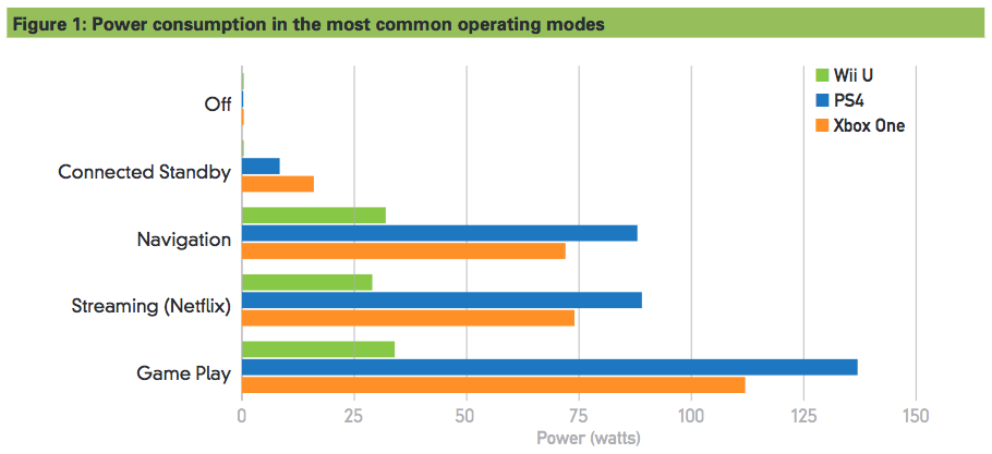 Spotřeba Xbox One je pak dána především tím, že slouží mimo jiné také k ovládání televizoru a konzole neustále vnímá hlasové pokyny, pomocí kterých ji můžete taktéž zapnout. U PS4 jsou pak podle NRDC neefektivní především USB porty. Ať již se zaměříme na hlasové pokyny u Xbox One nebo na USB porty u PS4, vše funguje nonstop, tedy i během noci, kdy nemáme zájem s konzolí komunikovat. PS4 totiž umožňuje to, co nedokázal její předchůdce, nabíjet ovladače přes USB porty i v době, kdy je konzole vypnutá. Xbox One pak poslouchá hlasové pokyny i v době, kdy to od něj nikdo nepotřebuje. Dvojice konzolí společně s Nintendem Wii U spotřebuje ročně jen v USA energii za více než miliardu amerických dolarů. Většina této energie je pak spotřebována uprostřed noci, kdy jsou konzole ve standby módu.