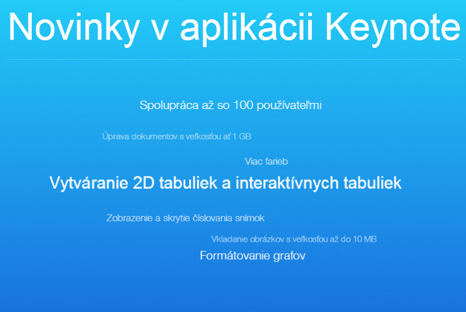 Apple opäť aktualizoval webovú verziu kancelárskej sady iWork for iCloud. Zmeny, ktoré najnovšie pribudli do aplikácií Pages, Numbers a Keynote, sa týkajú naozaj veľkých vecí. Spoločnosť totiž po novom umožňuje vytvárať a editovať dokumenty s veľkosťou až 1 GB, umožňuje pridávať fotografie s veľkosťou až do 10 MB a nakoniec zvyšuje limit ľudí, ktorí môžu upravovať dokument v jeden čas, na 100 z pôvodných 50. Otázkou v tomto prípade ale ostáva, či niekto plánuje upravovať jeden dokument so 100 ďalšími ľuďmi.