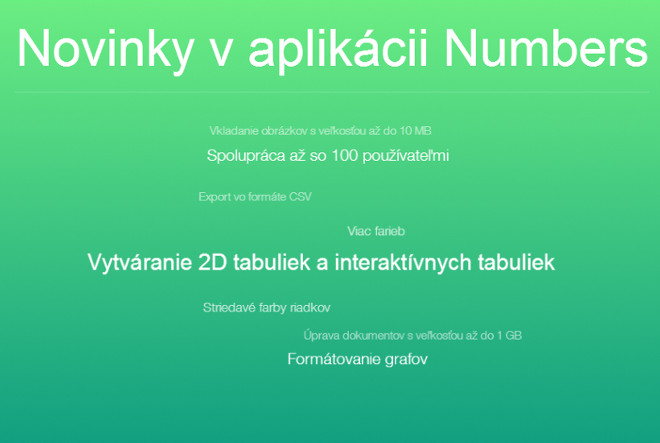 Po boku týchto zmien pribudla do aplikácií možnosť upravovať a vytvárať 2D tabuľky a interaktívne tabuľky a viac farebných možností. No a nasledujú aj individuálne zmeny. Pages bol obohatený o možnosť exportovať dokumenty do formátu ePub, vkladanie tabuliek, vrstvenie objektov a nakoniec pribudla možnosť formátovať grafy. Tabuľkový editor Numbers bol pre zmenu obohatený o možnosť exportovať dokumenty do formátu CSV, formátovanie grafov a možnosť nastaviť si striedanie farieb u riadkov. Keynote bol pre zmenu obohatený o možnosť zobraziť a skryť číslovanie snímok, ako aj o možnosť formátovať grafy. Dnešná aktualizácia sa týka výhradne webovej verzie sady, keďže neprináša žiadne funkcie, ktoré by sa predtým nenachádzali vo verzii pre iOS a Mac.