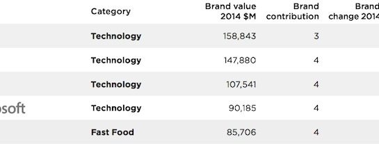 Pokles prekvapil aj spoločnosť Millward Brown, ktorá skonštatovala, že Applu sa na jednu stranu finančne darí, no na druhú stranu je otázne, či ešte stále prináša revolučné produkty do životov bežných ľudí. Na treťom mieste sa aj naďalej udržala spoločnosť IBM, avšak zaznamenala 4-percentný pokles hodnoty. Jej hodnota tak klesla na 107 miliárd dolárov. Do tabuľky Top 5 sa nakoniec dostal aj Microsoft, ktorý zaznamenal 20-percentný nárast hodnoty zo 69 na 90 miliárd dolárov a dostal sa tak do Top 4. Na piatom mieste je vidieť McDonald, ktorého hodnota klesla o 5% a ustálila sa na 86 miliardách. Najväčší nárast hodnoty ale zaznamenal Facebook, ktorý sa dostal na 21. miesto tabuľky vďaka 68-percentnému nárastu hodnoty. Jeho hodnota sa zvýšila z 21 miliárd na 36 miliárd. Facebook tak okrem iného predbehol aj Samsung, ktorý je na 29. mieste s hodnotou 26 miliárd dolárov.