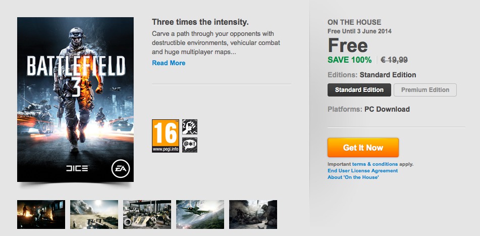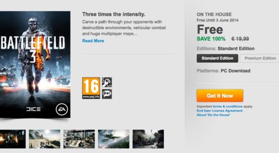 Battlefield 3 je totiž nyní možné stahovat přímo přes oficiální distribuční platformu EA Origin zcela zdarma. Jedná se o časově omezenou akci ,během které si může každý stáhnout Battlefield 3 zcela zdarma a to přímo zde. Hra je bohužel omezena pouze na Windows, vzhledem k tomu, že na Mac nevyšla. Pokud však EA někdy uvolní Battlefield 3 na Mac, je velmi pravděpodobné, že k němu budou mít přístup majitelé PC verze zcela zdarma a tak doporučujeme stáhnout hru i těm, kteří mají Mac. Hra je automaticky připsána k vašemu účtu a jakmile se objeví verze pro Mac, na 90% ji budete mít k dispozici zdarma, pokud nyní „zakoupíte“ verzi pro PC. Battlefield 3 zdarma bude k dispozici pouze do středy 3. 6. 2014.