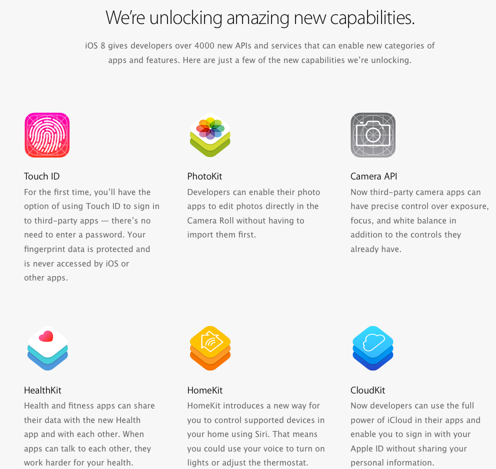 „S více než 800 miliony prodanými iOS zařízeními po celém světě je zde obrovská příležitost pro vývojáře,“ uvedl Craig Federighi Apple senior viceprezident softwarového inženýrství a dodává: „toto je největší iOS verze od spuštění App store. iOS 8 SDK nabízí více než 4000 nových API, včetně úžasných nových ramců, větší rozšiřitelnosti a revolučního nového programovacího jazyka.“ iOS 8 nabízí vývojářům robustní rámce, včetně HealthKit API, které poskytují možnosti pro zdravotní a fitness aplikace, které díky tomuto rámci mohou komunikovat navzájem. S vaším svolením, může každá aplikace používat specifické informace z jiných aplikací a tak poskytovat komplexní způsob, jak spravovat své zdraví a kondici. Například aplikace měřící váš krevní tlak může sdílet svá data s aplikací lékaře, jako je například aplikace Mayo Clinic, takže váš lékař vám může poskytnout kvalitní poradenství a péči.„Věříme, že Apple HeathKit je revolucí v tom, jak zdravotnický průmysl komunikuje s lidmi,“ řekl John Noseworthy, MD Mayo Clinic.
