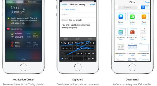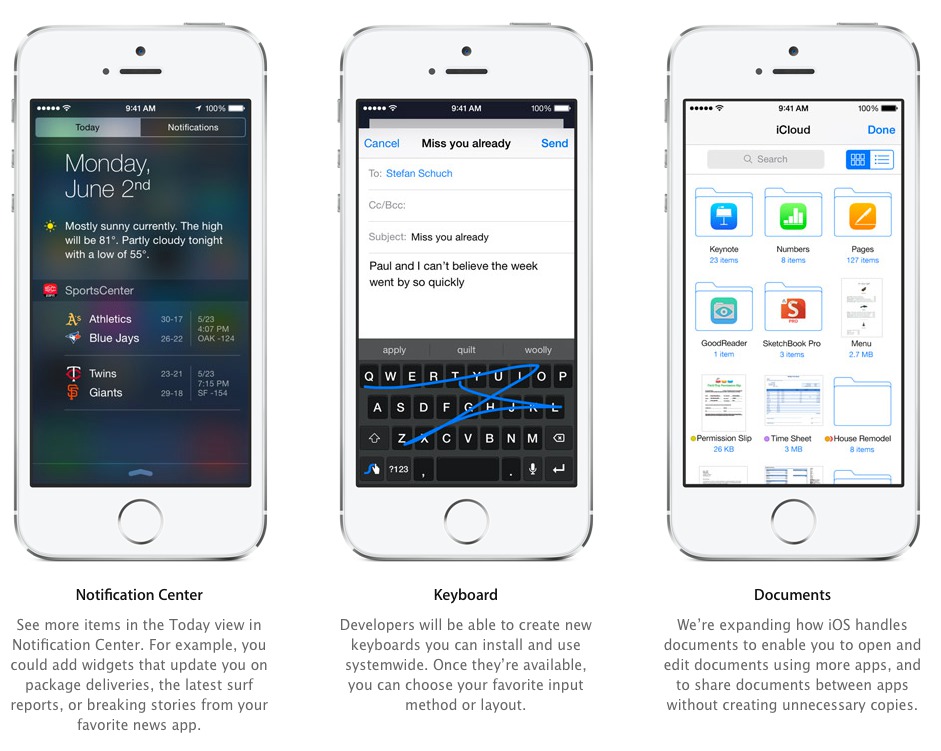Apple dnes zveřejnil své iOS 8 SDK, prozatím největší vývojářskou verzi vůbec s více než 4000 nových API, které vývojářům přináší možnost vytvářet nové úžasné aplikace tak, jako nikdy předtím. iOS 8 umožňuje vývojářům více přizpůsobit uživatelské zkušeností s hlavními funkcemi jako jsou widgety pro notifikační centrum a klávesnicemi třetích stran nebo funkcemi jako je HealthKit a HomeKit. iOS 8 také obsahuje Metal, novou grafickou technologii, která maximalizuje výkon čipu Apple A7 a Swift, nový programovací jazyk.