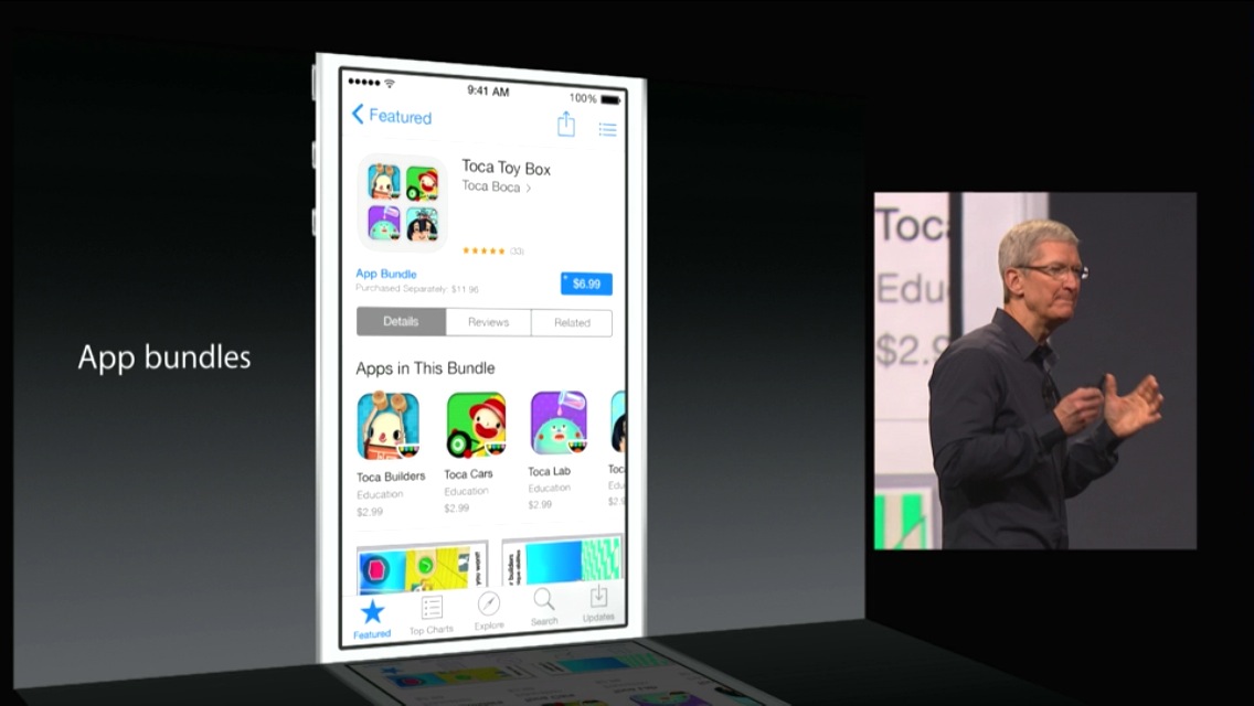 Ďalšie novinky sú viacmenej oficiálnou odpoveďou Applu na najväčšie priania vývojárov a taktiež si berú inšpiráciu z toho, čo je medzi užívateľmi najpopulárnejšie. Hneď na úvod to sú balíčky aplikácií. Je jasné, že človek si rád kúpi celý balíček aplikácií v prípade, že ich bude mať za nižšiu cenu. Práve na tom stavia nová funkcia a tak budú môcť vývojári vydávať balíčky aplikácií za zvýhodnenú cenu, od čoho si Apple sľubuje, že to bude mať veľmi veľkú popularitu. Vývojári tiež budú môcť do galérií vkladať krátke videá, ktoré užívateľom jasne ukážu, aká je vlastne pripravovaná aplikácia. Nakoniec je to spustenie testovacej platformy TestFlight, ktorá bude slúžiť pre účely otvoreného beta testovania aplikácií. Funkcia TestFlight bola vyvinutá spoločnosťou Burstly, ktorú Apple odkúpil začiatkom roku 2014. Vyššie menované novinky však z globálneho hľadiska nemôžeme pokladať za nič prevratné. Na počítačoch to totiž nie je žiadna novinka, cenovo zvýhodnené balíčky aplikácií, beta testy a videoukážky sú už dnes dostupné napríklad v populárnom hernom obchode Steam.