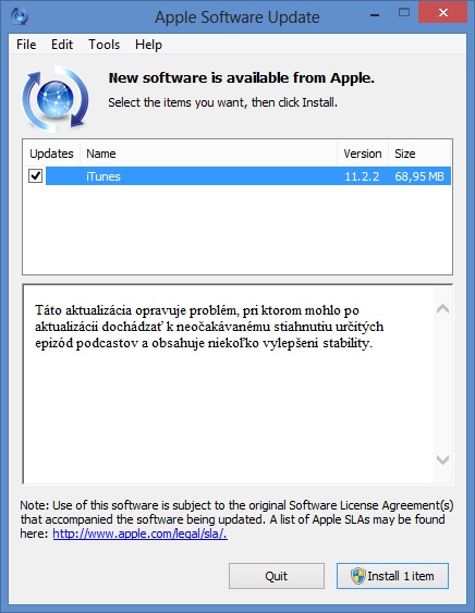Niekoľko dní po tom, ako Apple vydal iTunes 11.2.2 pre Mac, spoločnosť vydala túto aktualizáciu aj na počítače so systémom Windows. Aktualizácia iTunes 11.2.2 pre Windows sa nijak neodlišuje od tej, ktorú sme mohli vidieť pred pár dňami na Macu a teda opravuje problém, pri ktorom mohlo po aktualizácii na iTunes 11.2.1 dochádzať k neočakávanému sťahovaniu určitých epizód podcastov. Môžem pritom potvrdiť, že chybu so sťahovaním podcastov som zaregistroval na svojom počítači aj ja. Samotná aktualizácia má takmer 69 MB.