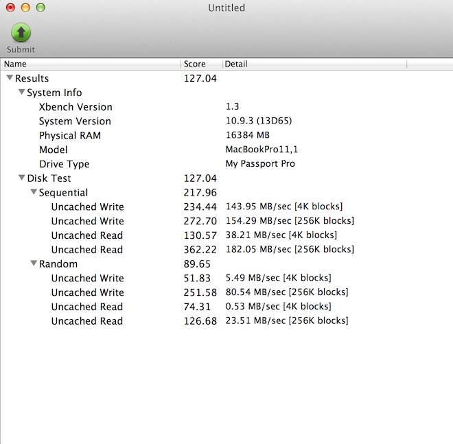 Poďme, ale k samotným testom. Disk som testoval na Apple Macbook Pro Retina 13” Late 2013, 2.6 GHz Core i5, 16GB Ram 1600MHz, 512 GB Flash. Testoval som variantu v RAID 1 aj RAID 0, JBOD som netestoval, nakoľko výsledok by bol cca rovnaký ako pri RAID 1.
