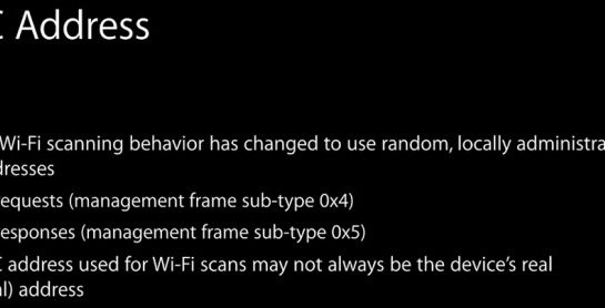 Pre bežných užívateľov to v tomto prípade znamená, že pri hľadaní bezdrôtových sietí je MAC adresa zariadenia anonymizovaná a tú pravú adresu odhalí až po tom, ako sa zariadenie pripojí ku konkrétnej WiFi sieti. Apple vo výsledku chráni súkromie užívateľov pred cielenou reklamou a analytickými spoločnosťami, z ktorých množstvo využíva MAC adresy pre tvorbu svojich štatistík. Jednou zo spoločností je spoločnosť Euclid Analytics, ktorá využíva MAC adresy telefónov iPhone preto, aby pomohla svojim klientom. MAC adresy síce neodhalia nič o majiteľovi, na druhú stranu firmám pomáhajú prispôsobovať vzhľad svojich obchodov, odhadovať správny čas na zahájenie časovo obmedzených ponúk, meria účinnosť reklám a dokonca pomáha určiť, kedy je v obchode najvyššia návštevnosť a v závislosti od toho vedia predajne prispôsobiť pracovné hodiny pre svojich zamestnancov.