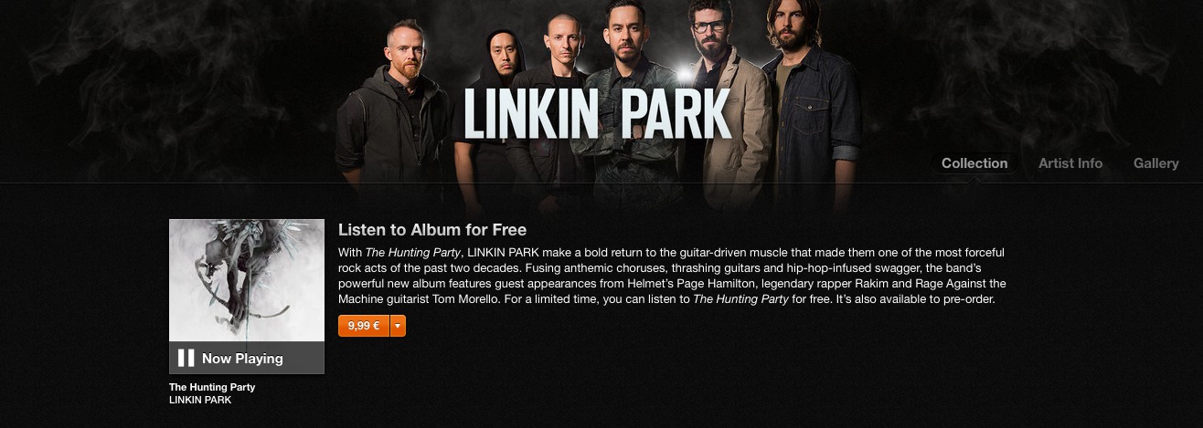 Vydání dalšího studiového alba Linkin Park, které tentokrát ponese název The Hunting Party, se nezadržitelně blíží. Pánové opět nabídnou nekonvenční směs rocku a rapu s přidáním sobě vlastních prvků. Aby Apple nalákal na předobjednávku alba, máte nyní přímo v iTunes možnost přehrát kompletně celé album. Album dlouhé 45 minut je dostupné k přehrání zcela zdarma přímo v iTunes Store a následně, pokud se vám album zalíbí, si jej můžete za cenu 9,99€ objednat.