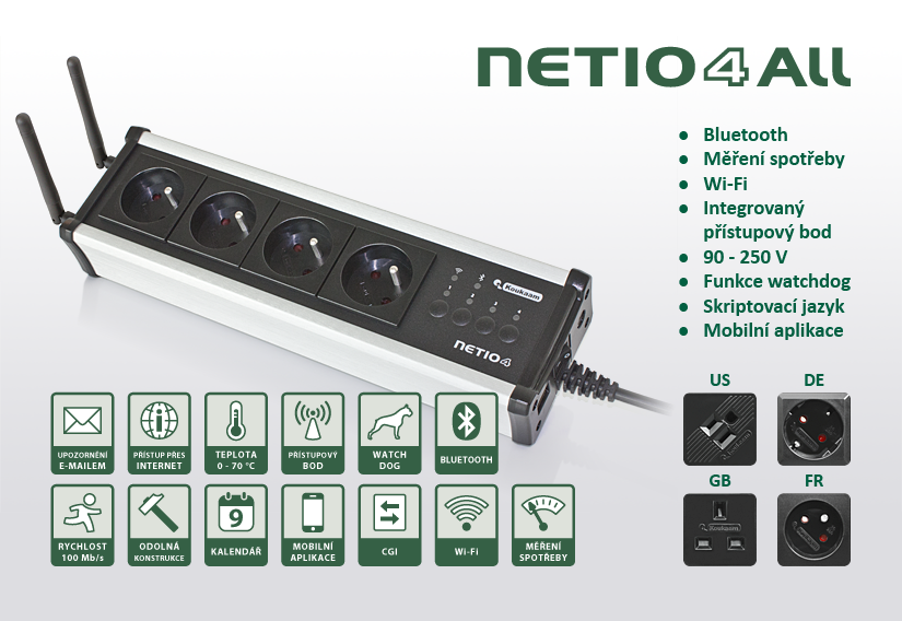 Česká společnost Koukaam představila v pořadí již čtvrtou generaci chytrých zásuvek, které lze ovládat prostřednictvím internetového prohlížeče, stejně tak i přímo z iOS nebo Android aplikace. V současné době jsou na trhu dva typy zásuvek, jednodušší Netio4 a pokročilejší verze Netio 4All. Kromě toho, že lze zásuvky ovládat přímo z iOS zařízení, je zajímavá také jejich výbava. Zásuvky totiž disponují Wi-Fi i Bluetooth technologií s tím, že se jedná o Bluetooth 4 LE a Wi-Fi může sloužit také jako extender, který rozšíří dosah domácí sítě.
