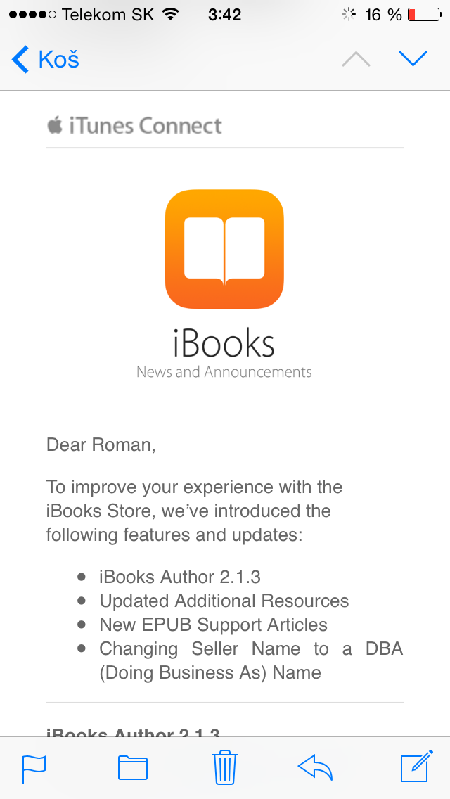 Apple dnes ráno rozposlal vývojárom informatívny e-mail, v ktorom ich informuje o novinkách súvisiacich so službou iBooks. Spoločnosť vo svojom krátkom e-maili uvádza, že vydala novú verziu aplikácie iBooks Author 2.1.3, po boku ktorej aktualizovala sekciu Ďalšie zdroje, doplnila do svojej databázy nové príspevky súvisiace s technickou podporou pre EPUB a tiež priniesla drobnú úpravu názvu pri zadávaní metadát pre knihu. Po novom sa tak v ponuke namiesto položky Seller Name (meno predajcu) objavuje položka DBA Name, čo predstavuje skratku pre ‚Doing Business As‘ Name.