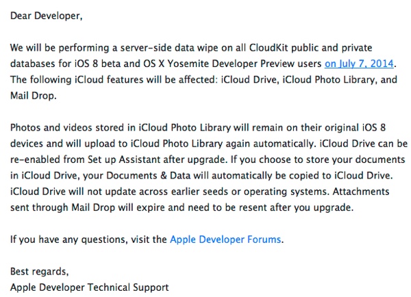 Apple behom víkendu informoval vývojárov o tom, že plánuje odstrániť dáta z verejných aj osobných databáz CloudKit pre služby iCloud Drive, iCloud Photo Library a Mail Drop, ktoré budú dostupné v systémoch iOS 8 a OS X Yosemite. K odstráneniu dát z vývojárskych serverov dôjde už zajtra, 7. júla/července 2014, čím spoločnosť naznačila, že skutočne plánuje už tento týždeň vydať nové beta verzie iOS 8 a OS X Yosemite. O plánovanom vydaní informoval už dávnejšie server BGR, ktorý tvrdí, že iOS 8 beta 3 vyjde 8. júla/července 2014.