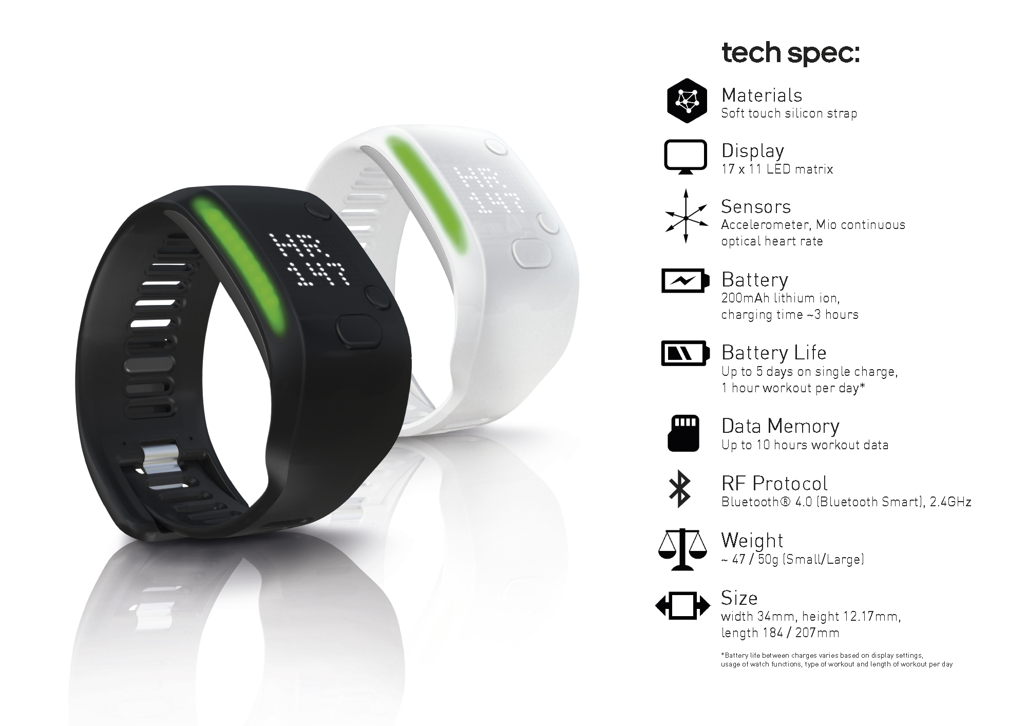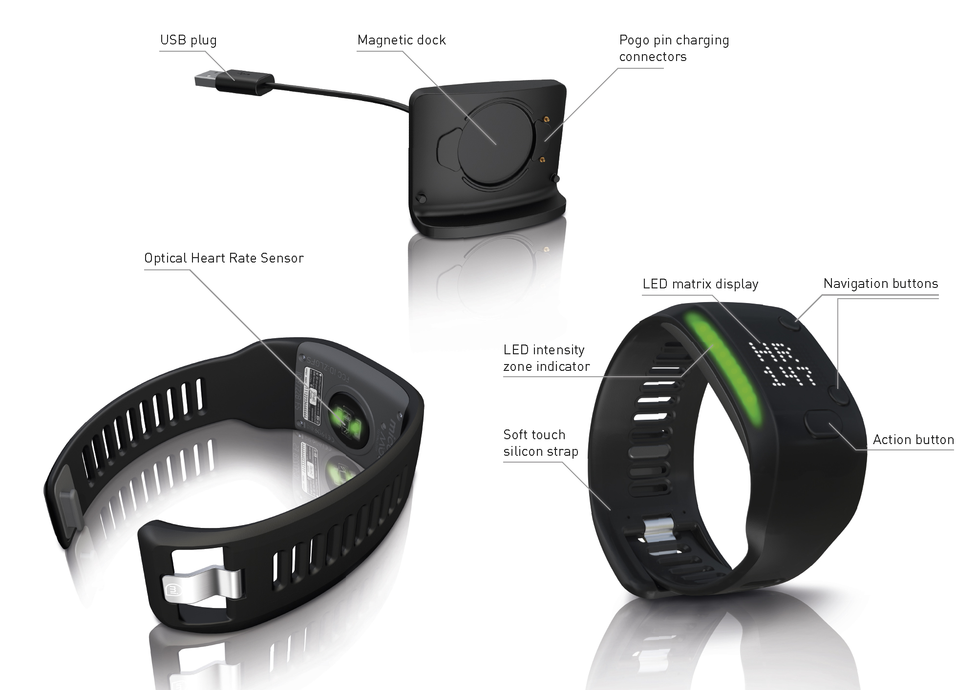 Mezi další funkce patří sledování spálených kalorií, rychlost běhu nebo chůze a vzdálenost, kterou jste urazili. Zajímavé, že pokud budete tracker využívat jednu hodinu denně aktivně a po zbytek dne jen jako hodinky, vydrží baterie s kapacitou pouhých 200mAh pět dní. Právě malá baterie zajišťuje nízkou hmotnost pouhých 58 gramů. Veškeré údaje jsou zobrazovány pomocí jednotlivých LED diod, který je dohromady 17×11. Veškeré naměřené aktivity následně synchronizujete s iOS nebo Android aplikací miCoach.
