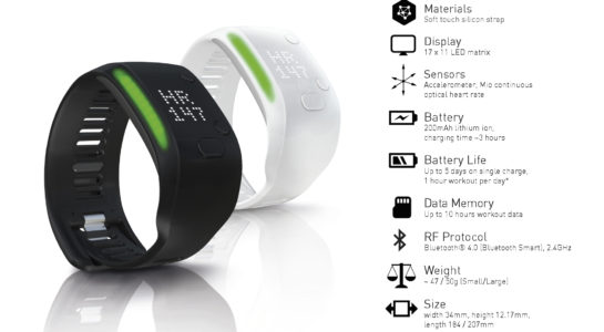 Mezi další funkce patří sledování spálených kalorií, rychlost běhu nebo chůze a vzdálenost, kterou jste urazili. Zajímavé, že pokud budete tracker využívat jednu hodinu denně aktivně a po zbytek dne jen jako hodinky, vydrží baterie s kapacitou pouhých 200mAh pět dní. Právě malá baterie zajišťuje nízkou hmotnost pouhých 58 gramů. Veškeré údaje jsou zobrazovány pomocí jednotlivých LED diod, který je dohromady 17×11. Veškeré naměřené aktivity následně synchronizujete s iOS nebo Android aplikací miCoach.