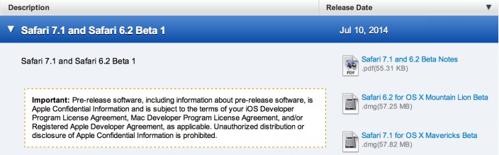 Apple najnovšie rozposlal vývojárom a testerom v AppleSeed programe prvú beta verziu Safari 7.1 a Safari 6.2, pričom obe verzie by sa mali dostať do rúk bežných užívateľov ešte pred vydaním operačného systému OS X Yosemite, ktorý vyjde koncom roku. Prvá beta verzia, Safari 7.1, je určená pre užívateľov operačného systému OS X Mavericks, zatiaľ čo verzia Safari 6.2 je určená pre užívateľov OS X Mountain Lion. Samotný update, ktorý by mal vyjsť v budúcich týždňoch alebo mesiacoch, prináša niekoľko noviniek pre WebKit.