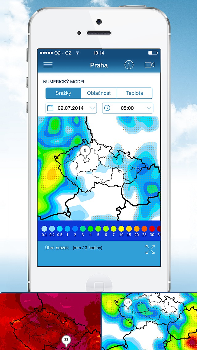Na 48 hodin dopředu v aplikaci naleznete podrobné předpovědi po třech hodinách, které nabídnou ucelený pohled na očekávané počasí v nejbližší době (zahrnují předpověď stavu počasí, teploty, úhrnu srážek a větru). Nechybí samozřejmě ani předpověď na další dny, ale již jen v souhrnném stavu pro celý den. V aplikaci naleznete také předpověď počasí zobrazenou přímo na snímcích z numerického modelu. Díky nim si můžete snadno prohlédnout předpověď srážek, teplot a oblačnosti, a to až na následujících 6 dní. Nabízí se tak pohled nejen na počasí ve zvoleném městě, ale v celé naší republice a střední Evropě.