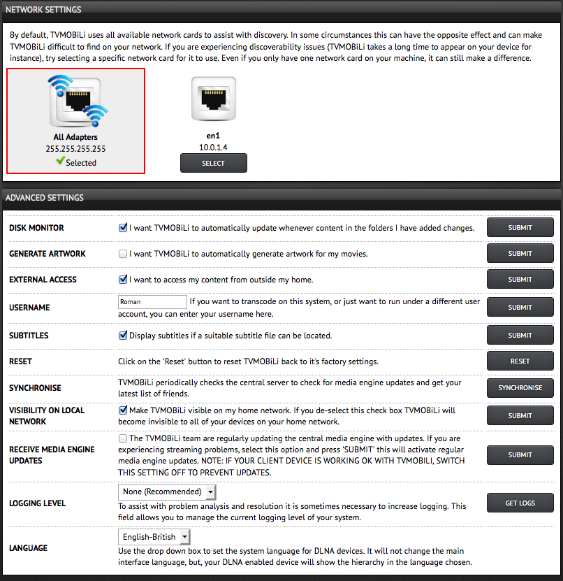 Poté co TVMOBILi nainstalujete do svého počítače, stačí jej pouze spustit a vybrat složky, jejichž obsah povolíte sdílet přes DLNA server, který aplikace z vašeho počítače vytvoří. Veškeré další nastavení pak probíhá přes webové rozhraní, které se otevře ve vašem prohlížeči internetu okamžitě po spuštění aplikace. V nastavení vidíte šest základních položek s tím, že pokud nechcete nic měnit, práce pro vás skončila nainstalováním aplikace a zvolením složek, o nic víc se skutečně již nemusíte starat. Pokud si však chcete s nastavením pohrát, pak v položce Content najdete zvolené složky, které můžete smazat nebo naopak přidat nové, které jsou zahrnuty do obsahu DLNA serveru.