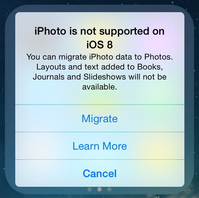 Chybová hláška potom poskytuje prístup k dvom možnostiam. Prvé, Migrate, umožní migrovať dáta z aplikácie do fotogalérie. Druhá položka, Learn More, odkazuje na webovú stránku, ktorá ale momentálne nie je k dispozícii. Rozhodnutie zrušiť vývoj aplikácie iPhoto sa zdá veľmi zvláštny, keďže pred ukončením nepopulárnej služby Cards Apple upozorňoval užívateľov, že tí, ktorí chcú naďalej pracovať na pohľadniciach, ich môžu vytvárať v iOS verzii aplikácie iPhoto. Tá ale s vydaním iOS 8 nebude dostupná a je len otázne, ako budú môcť užívatelia upravovať svoje grafické práce potom. Ako jedna z možností sa zdá, že Apple sprístupní danú možnosť v počítačovej verzii aplikácie Photos, ktorú uvoľní pravdepodobne bezplatne začiatkom budúceho roku.