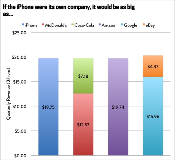 Ak by to tak bolo, potom by iPhone zarobil za uplynulý štvrťrok viac, než McDonald’s a Coca-Cola dohromady, prípadne Google a eBay dohromady. iPhone totiž zarobil za minulý rok uvádzaných 19,75 miliárd amerických dolárov, zatiaľ čo McDonald’s zarobil 12,57 miliardy dolárov, Coca-Cola 7,18 miliárd amerických dolárov. Google potom za uplynulý štvrťrok zarobil 15,96 miliárd dolárov, zatiaľ čo eBay 4,37 miliardy amerických dolárov. Najbližšie z hľadiska zisku je potom Amazon, ktorý za uplynulý štvrťrok zarobil 19,74 miliárd amerických dolárov. 19 miliárd je dokonca viac, než HDP na Islande alebo v Mongolsku, prípadne to môže mať 1% vplyv na HDP Spojených štátov.