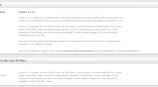 Apple poměrně nečekaně vydal novou verzi multimediálního přehrávače iTunes, který tak povýšil na verzi iTunes 11.3.1, která opravuje dvojici chyb, jenž souvisí s podcasty. Chyby které obsahovala předchozí verze iTunes způsobovaly pád nebo zamrznutí iTunes během procházení stažených epizod podcastů a také zastavení automatických aktualizací podcastů.