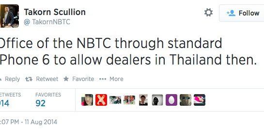 Generální tajemník Národní komise pro telekomunikaci a vysílání (NBTC) v Thajsku Takorn Tantasith oznámil, že agentura schválila žádost Applu pro prodej dvojice modelů iPhone 6. Tajemník to taktéž oznámil na svém oficiálním účtu na sociální síti Twitter. Apple údajně požádal o povolení prodeje 5. srpna a certifikát obdržel písemně odsouhlasený dne 8. srpna 2014. Apple žádal o povelení prodeje dvojice telefonu iPhone 6 s modelovým označením A1586 a A1524. Podle vládních předpisů v Thajsku musí agentura tyto žádosti zveřejnit.