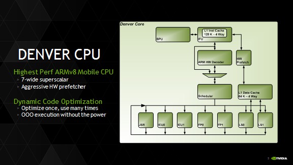 Tegra K1 Denver v skutočnosti obsahuje dve 64-bitové jadrá a tiež obsahuje obľúbený grafický čip nVidia Kepler. Logický procesor je podľa slov nVidie úplne prvým procesorom, ktorý si navrhla ona sama a ktorý je kompatibilný s architektúrou ARMv8, s ktorou je kompatibilný aj procesor Apple A7. Čip ďalej obsahuje 128 kB L1 cache pre inštrukcie, 64 kB L1 cache a 2 MB L2 cache. Procesor, narozdiel od Apple A7, je schopný vykonávať až 7 operácií naraz, zatiaľ čo Apple A7 ich dokázal vykonať „len“ 6 a predošlý model Tegra K1 len tri.