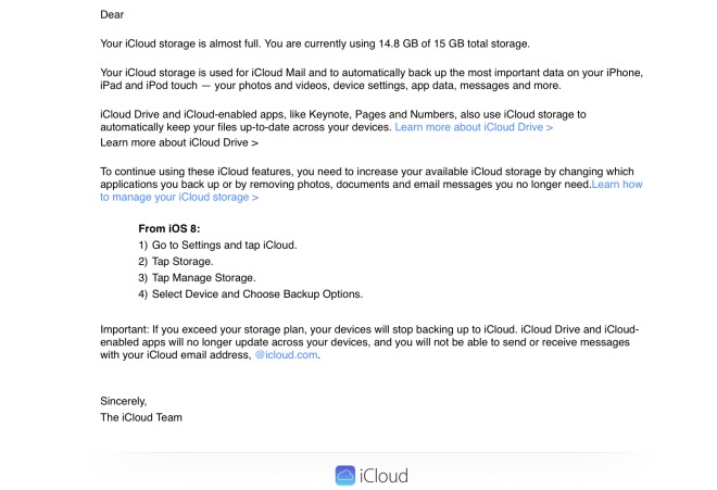 Niekoľko týždňov predtým, než by mal Apple oficiálne vydať iOS 8, už spoločnosť upravila svoje e-maily, v ktorých informuje užívateľov o tom, že ich iCloud úložisko je takmer plné. Po novom už Apple začal v týchto e-mailoch zmieňovať, ako je možné spravovať úložný priestor v iOS 8 a tiež prezentuje službu iCloud Drive, ktorá má byť vypustená súčasne s iOS 8.