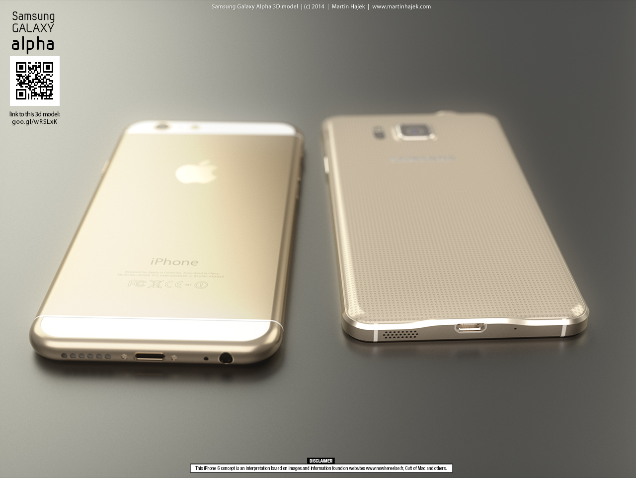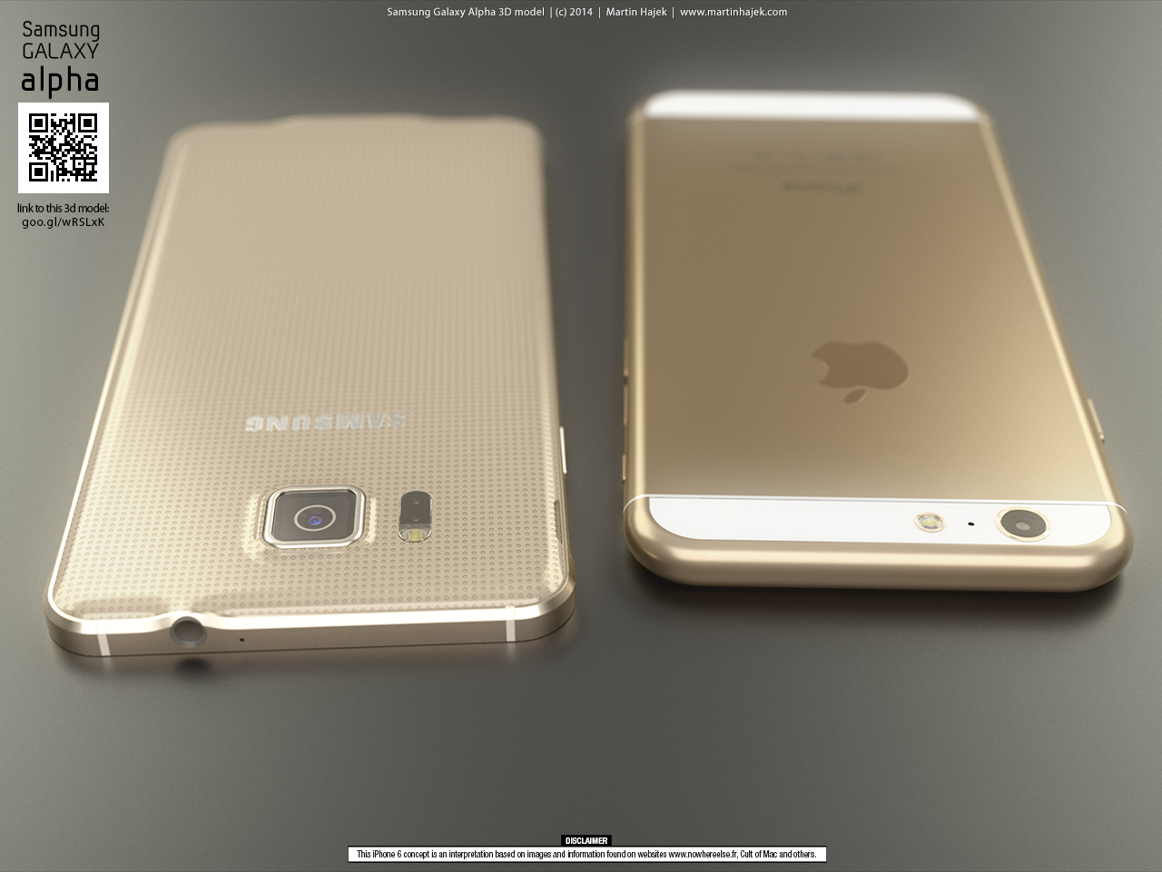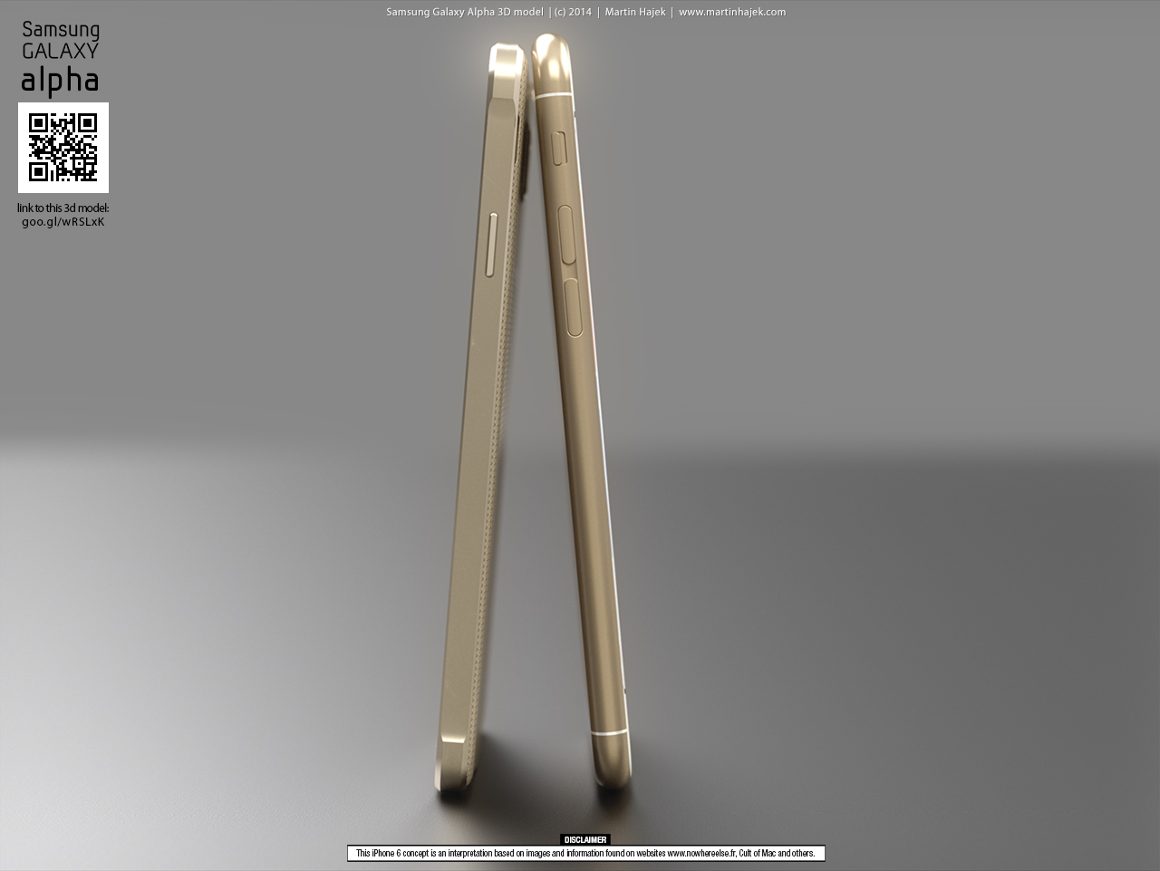 Říkáte si, půlka týdne a žádný koncept od Martina Hájka na obzoru? To snad ani není možné, co se s ním proboha stalo. Když v tom se na jeho oficiálních stránkách www.martinhajek.com objeví nové rendery ve kterých se máme možnost podívat na to, jak vypadá nový Samsung Galaxy Alpha ve srovnání s iPhone 5s a také ve srovnání s iPhone 6. Na to proč Martin podobné věci dělá se ptejte spíše jeho než nás, jedno je však jasné, články s jeho koncepty se čtou velmi dobře a tak je jasně vidět, že se lidem líbí, když se mají možnsot podívat na vizualizace nečeho, co nikdo na světě prozatím neviděl, tedy kromě zaměstnanců samotného Applu.