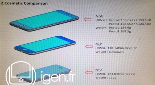 Francouzský server iGen.fr zveřejnil řadu nových fotografií, na kterých je vyfocen monitor se schéma iPhone 6 a to jak v 5,5″ verzi, tak i v 4,7″ verzi. Obrazovky zároveň jasně ukazují logo společnosti Foxconn, která pro Apple montuje právě mobilní telefony iPhone a další zařízení. Fotografie skutečně vypadají tak, že jsou vyfoceny přímo ve Foxconnu a jsou na nich zachyceny výrobní schéma pro nový iPhone, který je označen jako produkt N56 a N61.