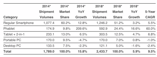 V prípade phabletov by to potom znamenalo, že trh phabletov zažije významný nárast a kým tento rok sa očakáva, že sa podarí predať 175 miliónov phabletov, v roku 2018 by to už malo predstavovať 592 miliónov. Súčasne s tým vzrastie aj ich podiel na trhu smartfónov, kde v súčasnosti phablety tvoria 14% a v roku 2018 by mohli tvoriť 32,2%. Z hľadiska všetkých zariadení by potom podiel phabletov vzrástol zo súčasných 9,8% na 24,4%.