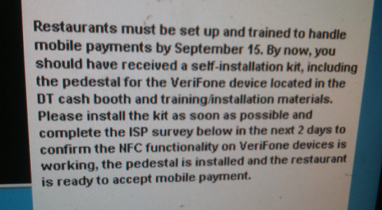 McDonald’s by mal k tomuto využívať systém VeriFone, ktorý hodlá sprevádzkovať do 15. septembra/září, čo je len pár dní pred očakávaným zahájením predaja iPhone 6. Systém sa však už podarilo nainštalovať do niektorých predajní, no ešte stále je treba systém otestovať a tiež treba pripraviť zamestnancov na používanie nového systému. Či to však súvisí zrovna so zahájením predaja iPhone 6, je diskutabilné, keďže jedna z najväčších fast-foodových sietí na svete má v týchto dňoch testovať mobilnú aplikáciu, ktorá umožní zákazníkom objednať si jedlo a následne ho vyzdvihnúť v niektorej z reštaurácii. V takomto čisto mobilnom prípade sa už celkom dá čakať, že aj platenie bude prebiehať s pomocou telefónu.