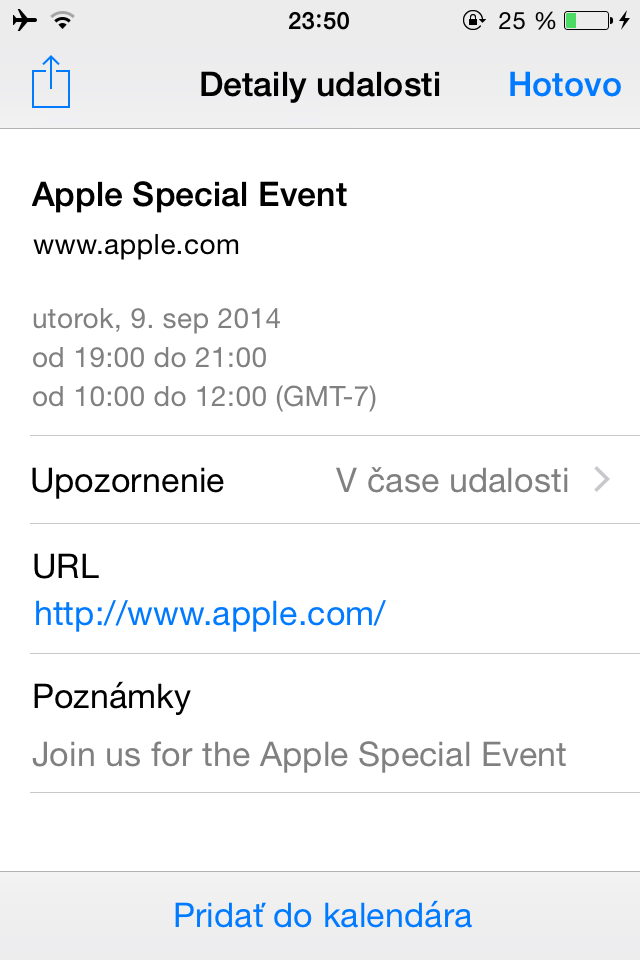 Náš čitateľ Samuel Dikant sa s nami podelil o skutočne zaujímavý objav súvisiaci s tohtoročným Apple Media Eventom. Kým my sme sa doteraz zaujímali prevažne o účel záhadnej budovy, teraz získavame informáciu o dĺžke eventu, ktorá nám len potvrdzuje, že Apple toho predstaví pozajtra naozaj veľa. Event totiž trvá dve hodiny, čiže od 19:00 do 21:00 nášho času. Septembrový event, na ktorom bude mimo iného predstavený aj iPhone 6, je zároveň o hodinu dlhší, než event, na ktorom spoločnosť minulý rok predstavila iPhone 5s a iPhone 5c.